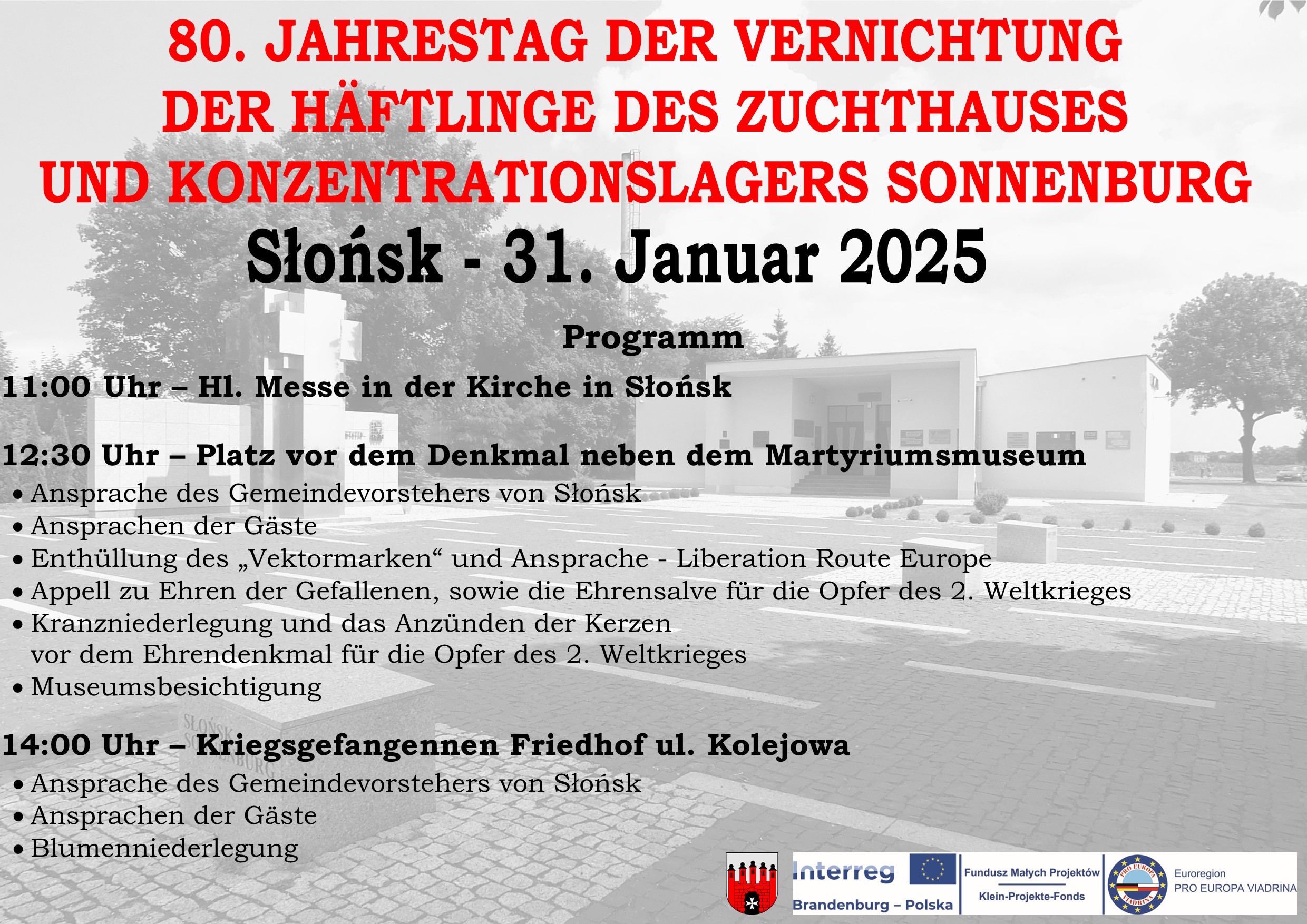 Die Veranstaltung begann mit einem Gottesdienst, gefolgt von einer Zeremonie am Denkmal beim Museum der Märtyrer. Vertreter aus Polen, Deutschland und Luxemburg hielten Redebeiträge, u. a. der Bürgermeister von Słońsk, Janusz Krzyśków, und der luxemburgische Botschafter Paul Schmit. Ein Höhepunkt war die feierliche Enthüllung des „Vektors der Erinnerung“, Teil der Gedenkroute Liberation Route Europe.
